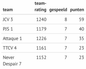 NTTB-PJS-1 speelde thuis in Vught, uit bij JCV-3, met Johan, Kees en Remko tegen de koploper in de poule. Er werd met 7-3 verloren. Johan won 2 partijen, Remko 1.